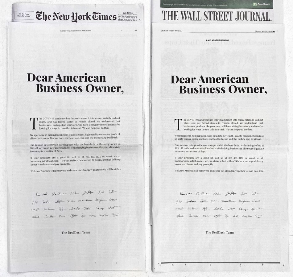 To help local businesses that had to close temporarily due to the pandemic, we ran a full page ad in the New York Times and Wall Street Journal inviting business owners to reach out to us regarding potential partnerships to help them liquidate excess inventory. We will continue to partner with amazing brands and small business from all over the United States and the world to pass on amazing savings to our customers and also to help out those in need.